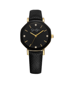 Jessica Simpson Accessories Jewelry Metallized Bezel Strap Watch In Black & Gold Tone