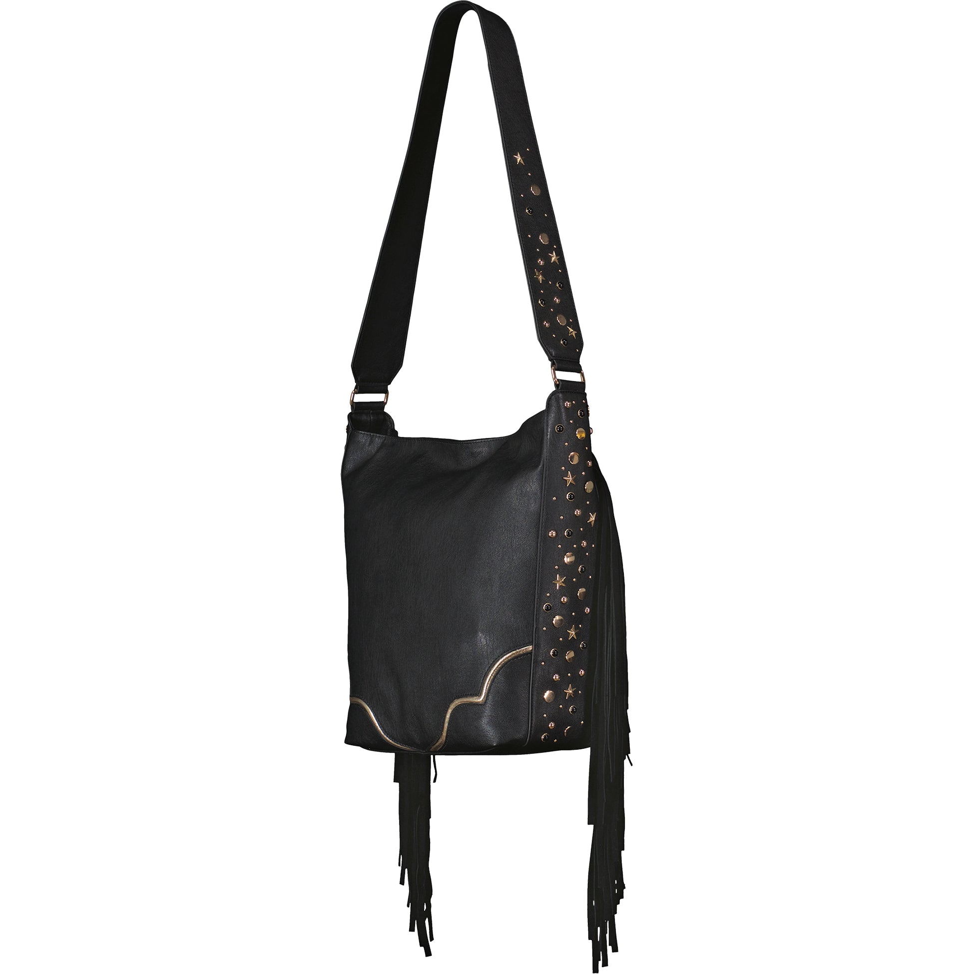 A slouchy bucket bag with fringe on the sides, a wide comfy strap, and a soft suede-like finish. Easygoing vibes with a little boho flair!
