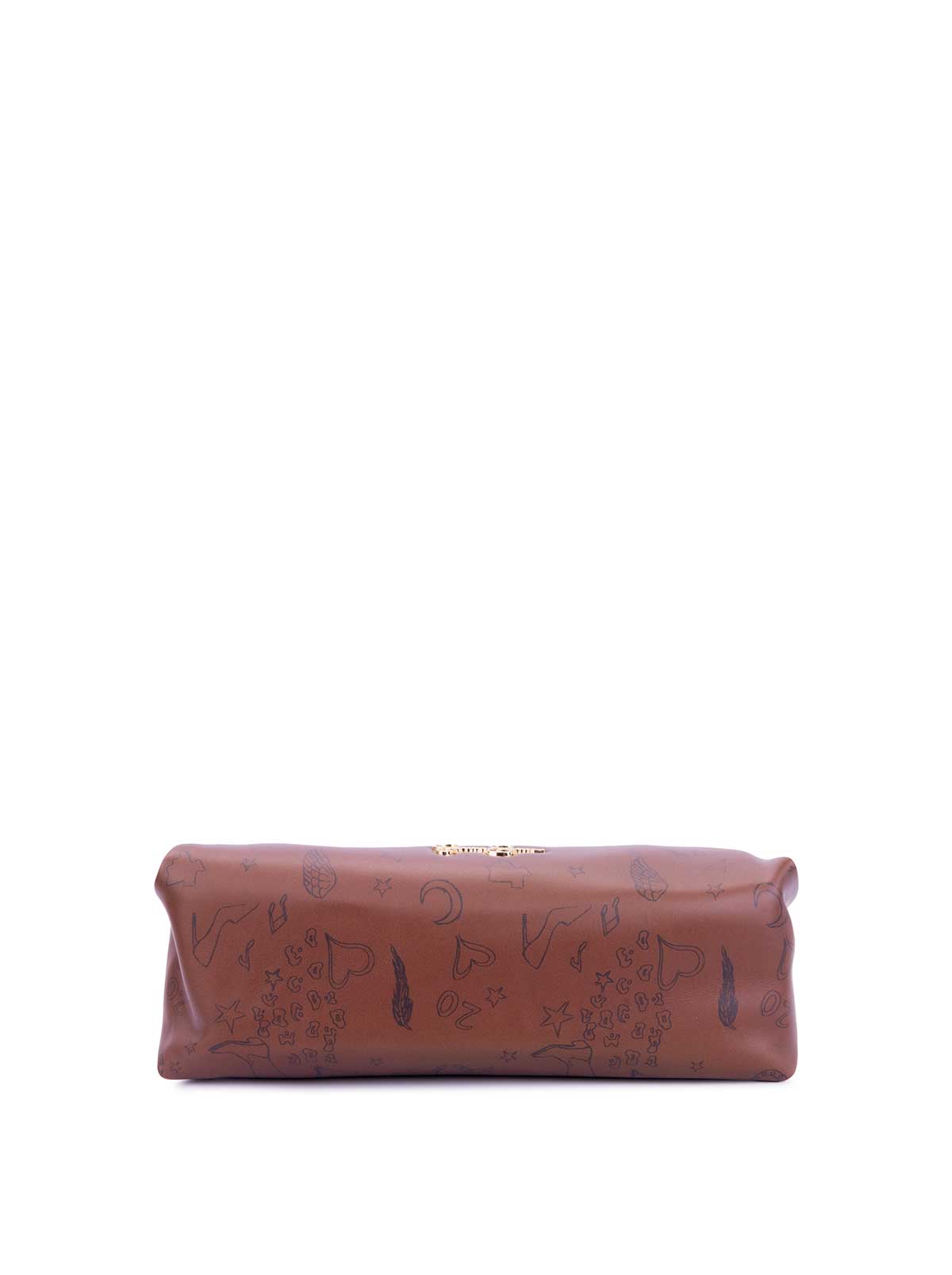 This bag is pure boho-cool with a twist. Crafted in smooth brown leatherette, it’s covered in whimsical doodles—eyes, stars, lips, feathers, notes, and more—that give it an artsy, free-spirited vibe. The chunky knotted handle adds a modern edge, making it the perfect grab-and-go piece for someone who wants a bag as playful and expressive as their style.