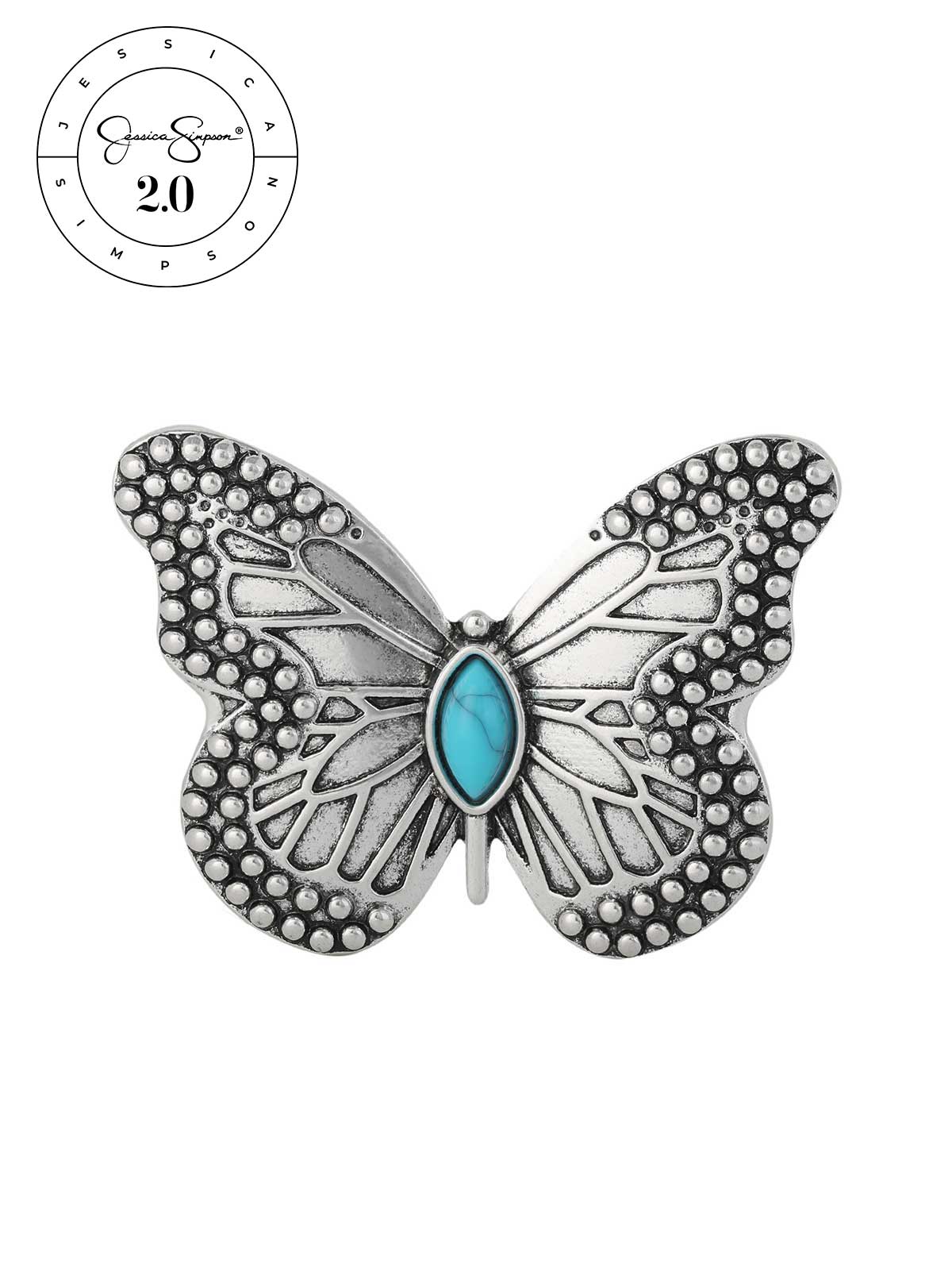 This Butterfly Turquoise Brooch features an oxidized finish that highlights its intricate detailing, accented by a smooth turquoise center. A symbol of transformation and beauty, this piece adds distinctive character to jackets, scarves, and handbags.