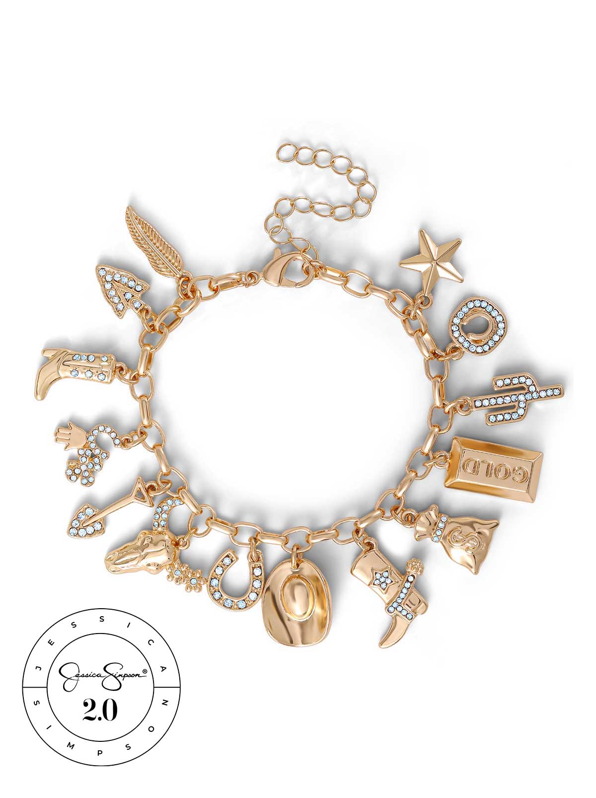 A playful gold bracelet with multiple charms including western inspired symbols, perfect for making a statement
