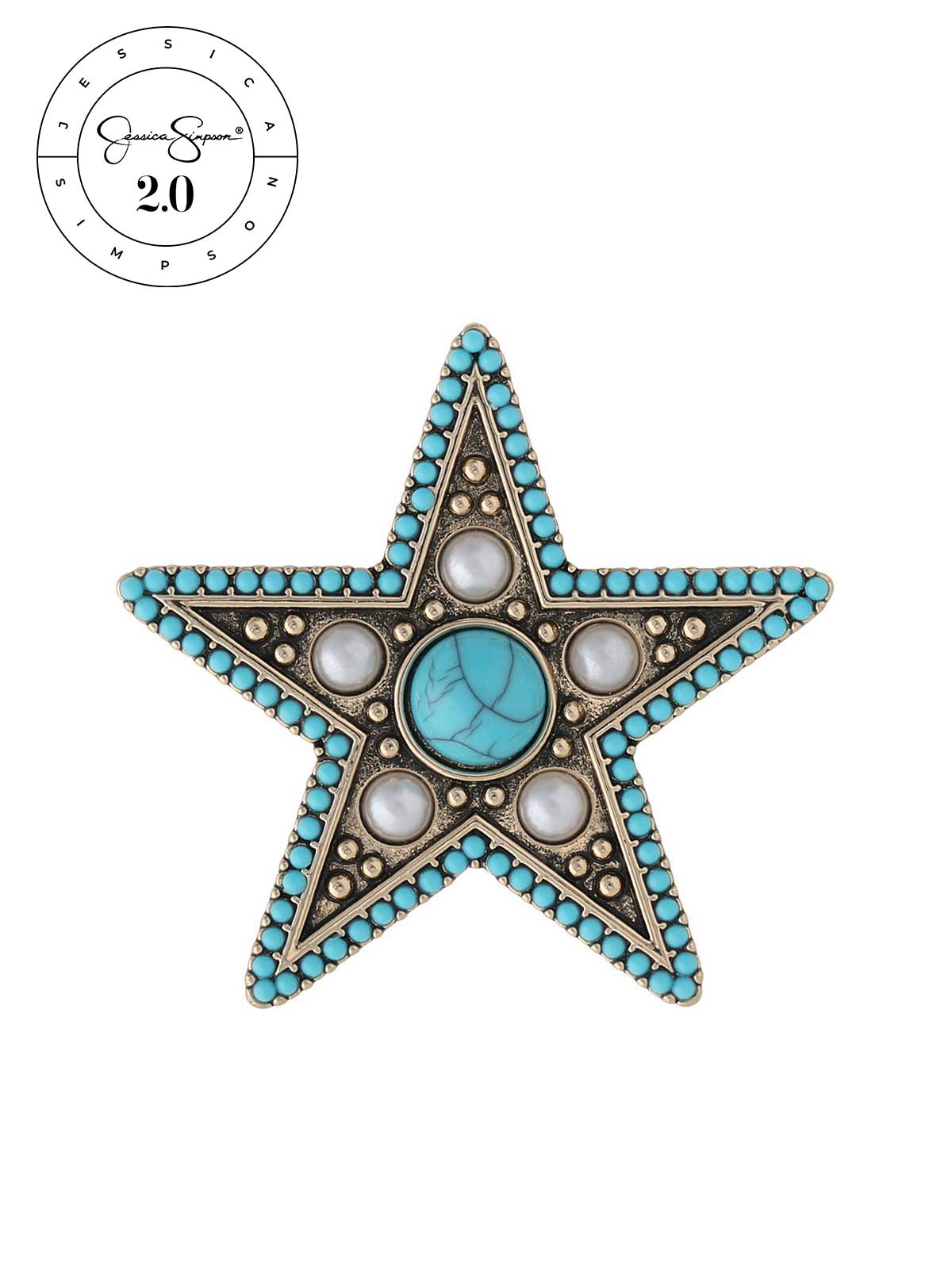This Turquoise Imperial Star Brooch showcases a bold turquoise center surrounded by delicate faux pearls. With its timeless star design and elegant contrast of textures, this piece brings a refined touch to coats, dresses, and accessories.
