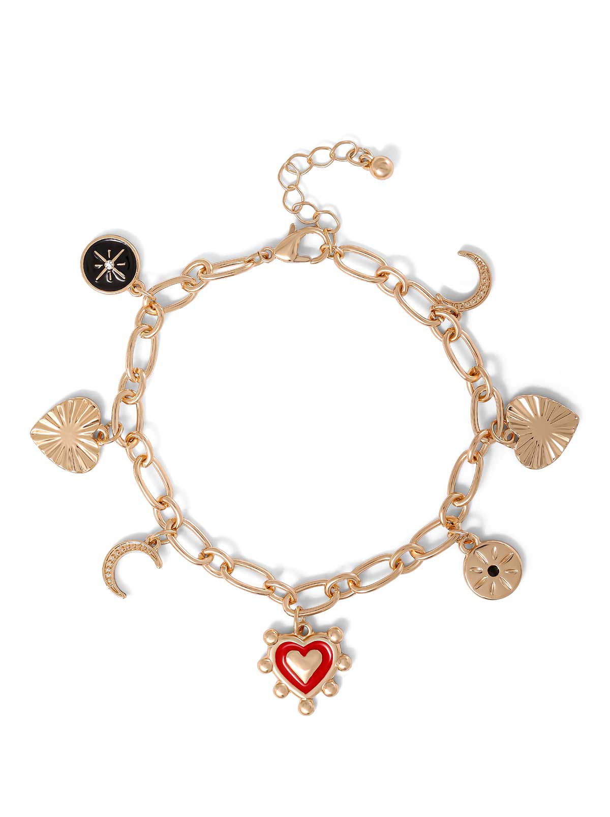 A trendy gold bracelet with a mix of charms, including a heart-shaped charm and various detailed accents