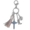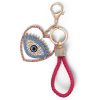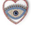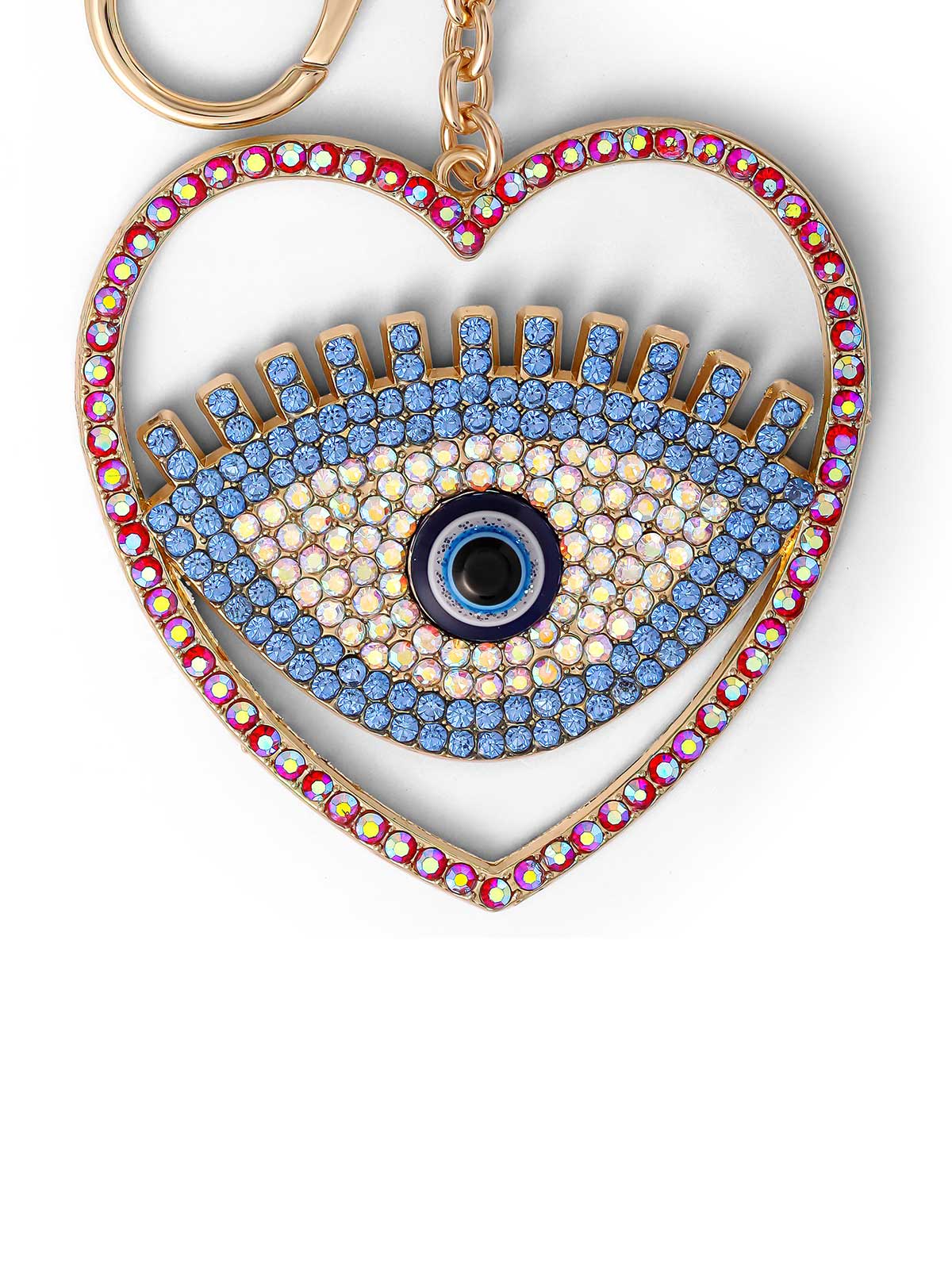 A beautiful keychain with a heart-shaped pendant featuring an eye design, adorned with sparkling blue and gold accents for a protective charm