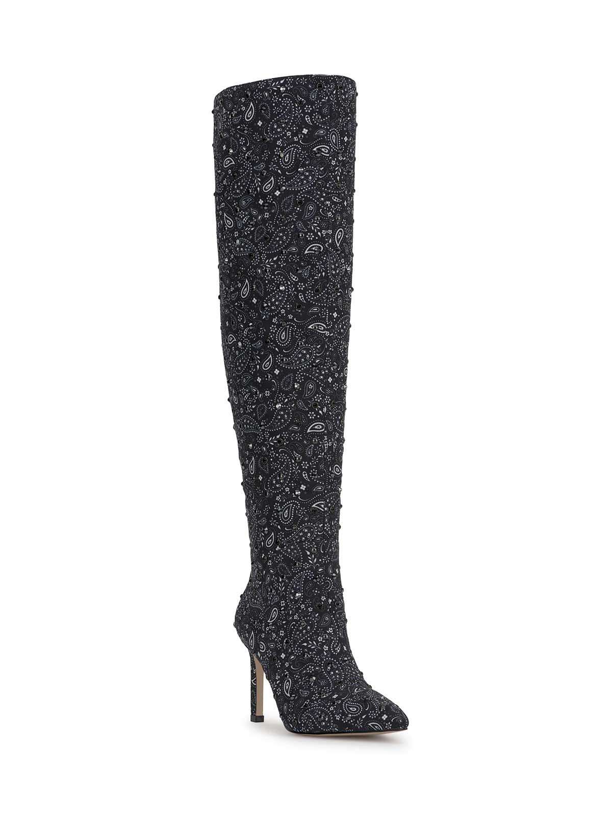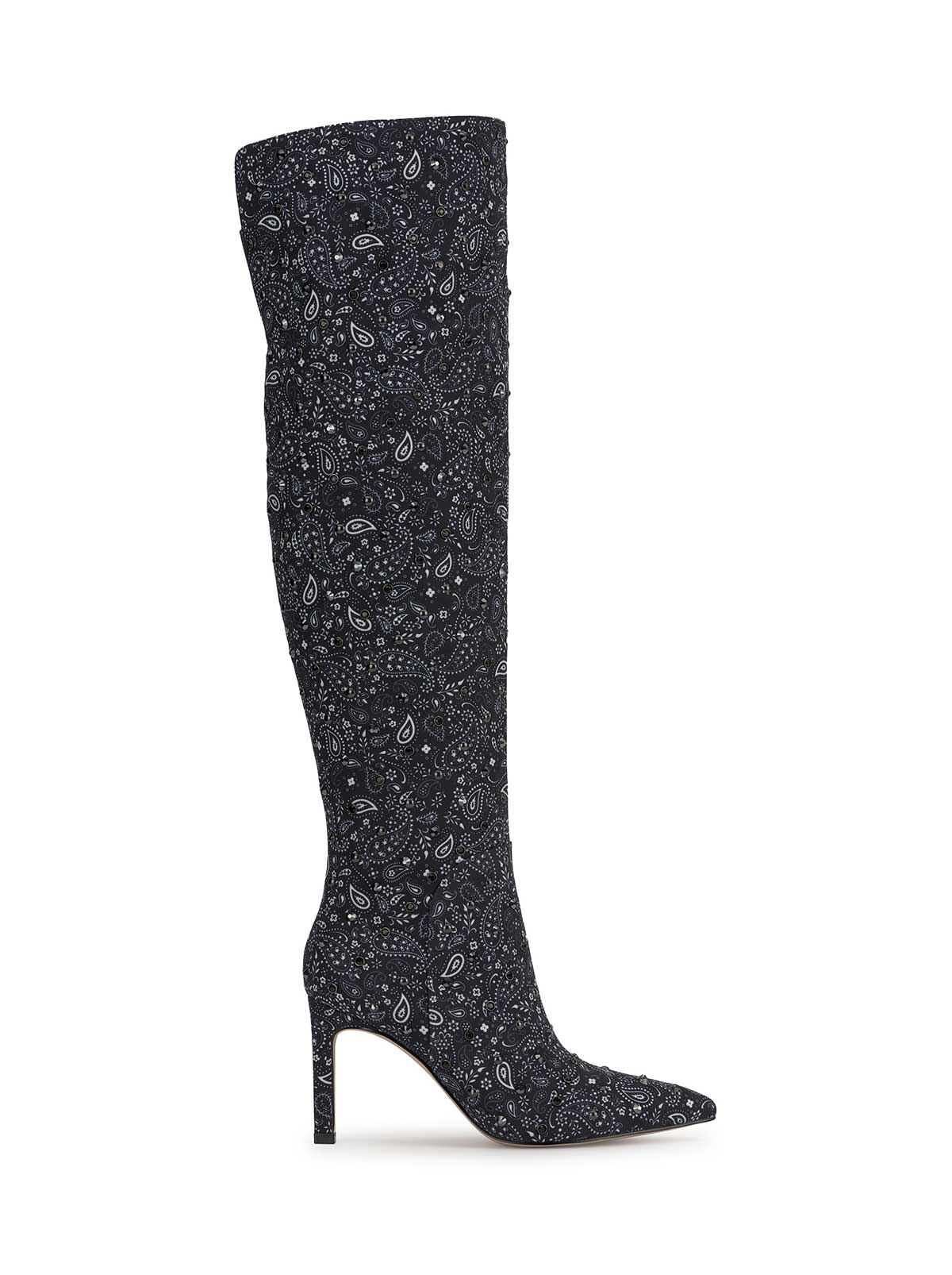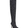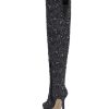 This over-the-knee, high-heeled boot has a pointed toe and a slim stiletto heel giving it a sleek and elegant look