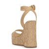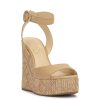 Step into effortless summer style with these elegant wedge sandals. Featuring a smooth leather upper and an adjustable ankle strap with a gold braided buckle, these shoes provide both comfort and sophistication. The woven raffia-style platform and wedge heel add a touch of natural charm, making them perfect for casual outings or dressier occasions. With their timeless design and versatile look, these wedges are a must-have addition to your warm-weather wardrobe.